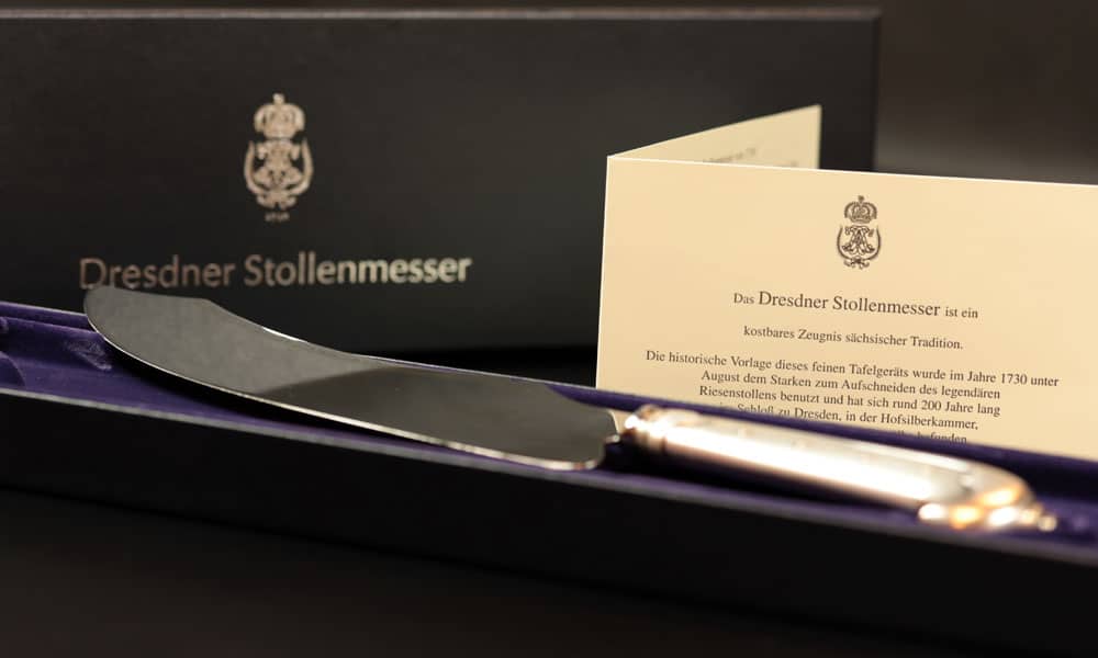 Das Dresdner Stollenmesser aus Zeiten August des Starken wird nach einer historischen Vorlage aus der Hofsilberkammer des Dresdner Schlosses von 1730 handwerklich gefertigt.